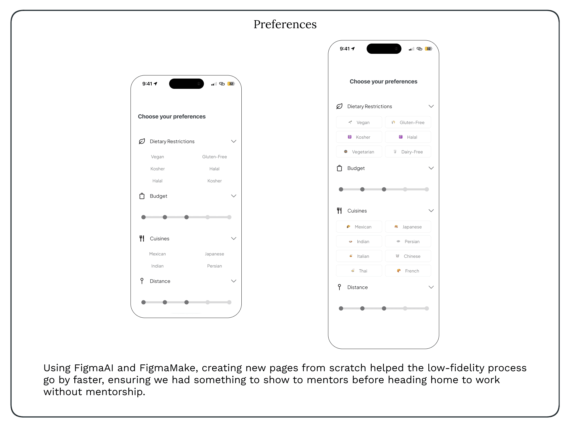 Wireframes focused on guiding users quickly from preference input to a final decision.