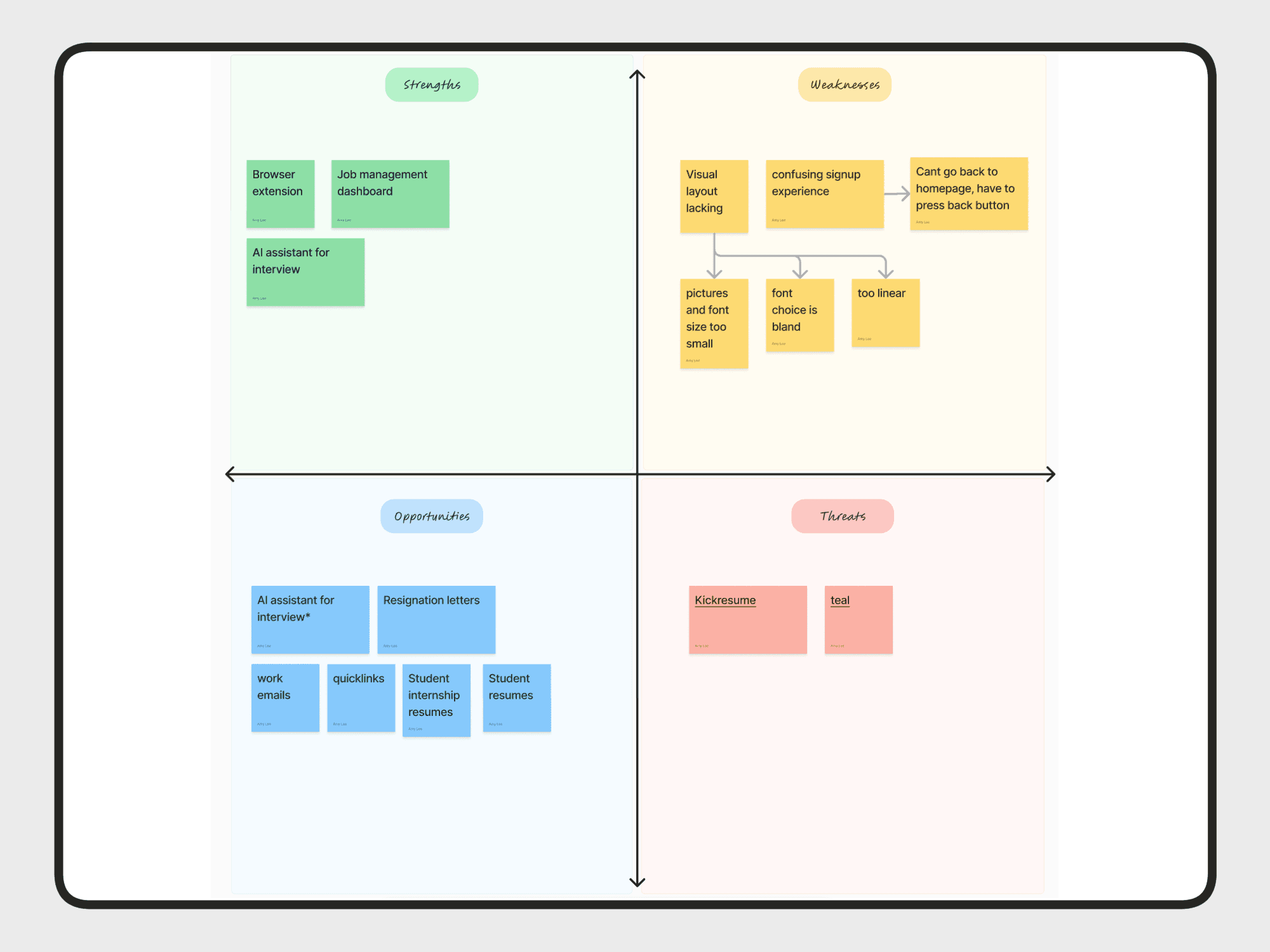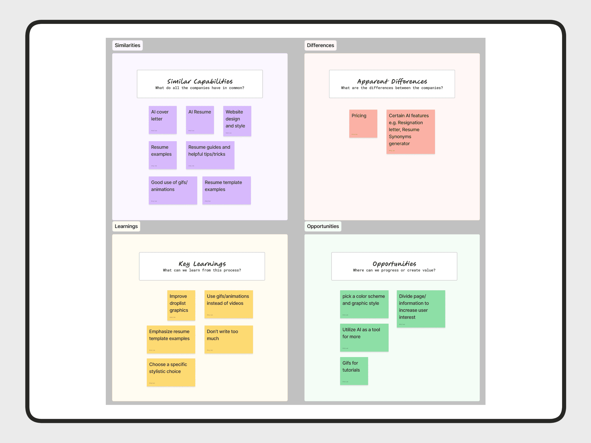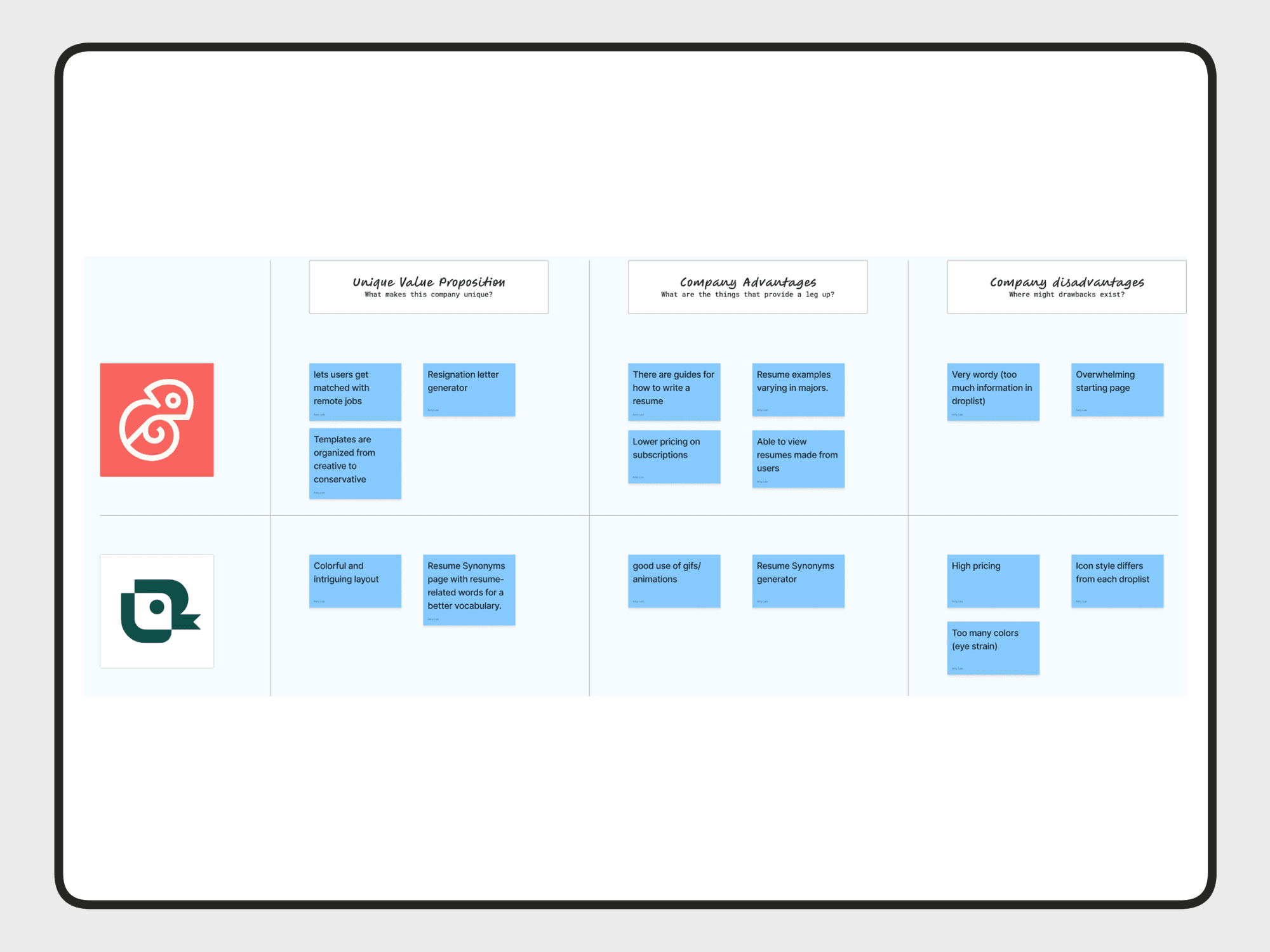 Looking at two competitors helped scope the project. Looking at KickResume and Teal helped establish what we needed to focus on. Through this analysis, I was able to determine what is valuable and what could be changed.